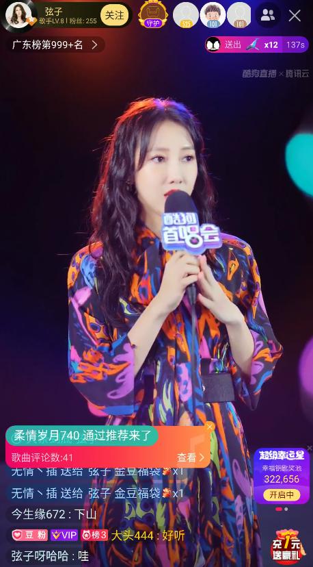 演唱中,直播间陆续涌入大批来自酷狗音乐的观众,原来大家都是在酷狗听歌页面及时收到开播通知,点击提示一键跳转直播间,与弦子一起回忆青春~不得不说,酷狗音乐联动酷狗直播的功能太强了,值得为它疯狂打call!