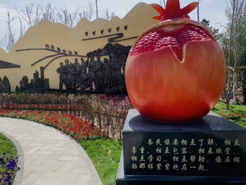 石榴雕塑和浮雕墙象征着各民族紧密团结在一起
