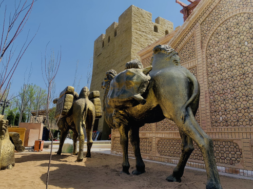 丝路烽燧和大漠驿站旁,骆驼雕塑栩栩如生,建筑表面是新疆民居特有的砖花