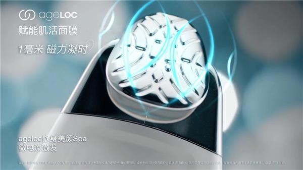 (图中的磁力是指电离子微粒被ageLOC微电流激发后,会在肌肤表面形成“磁场”一样的呵护场,成分中的肌肤保湿组分、肌肤护理组分、咖啡因等提亮肤色的组分,在微电流作用下渗透肌肤表层,给肌肤带来呵护。)