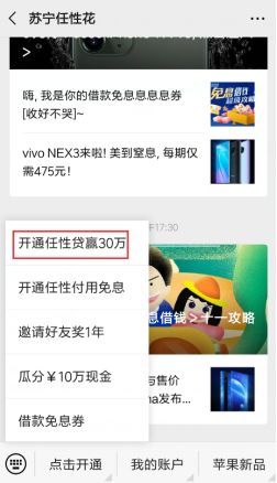 任性贷还新增了一条微信开通的便捷渠道,只要关注“苏宁任性花”微信公众号,点击“点击开通”申请菜单中的“开通任性贷赢30万”,可直接通过填写资料,申请任性贷,无需下载苏宁金融APP,流程简单易申请。