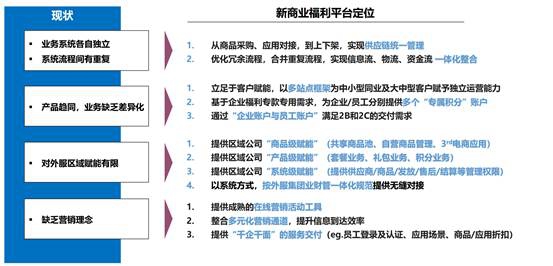 B端的服务平台,企业SaaS工具。公司围绕衣食住行游购娱健等员工福利需求,构建商业福利生态圈,通过SaaS平台推出年节福利、福利积分和创新福利产品,为企业提供"咨询+技术+服务"的整体解决方案,实现"千企千面"的一站式福利交付。