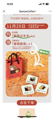 2022年我们推出了十周年联名限定实体产品及NFT数字艺术纪念品系列,多个涉及服装、化妆品、香氛、宠物、玩偶IP等联名活动及产品。在文化创意及IP联名方面,22年初与沪上知名艺术场馆——"浦东美术馆"一起推出虎年春节限定产品,以中国宫灯为灵感,享受咖啡的同时又可以获得一件有纪念意义的桌面装置艺术品。2022下半年公司与国际着名IP形象"LINE Friends"联名推出可爱形象的"MINI LINE"系列周边,深受年轻族群喜爱。除特定的文创、联名产品外,Seesaw还主推节日产品,助推节日经济及又纪念意义的产品。