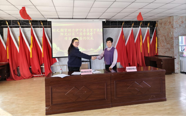 在伊宁县,马隽鸿代表创元期货与吉里于孜镇阳光社区签订了《国学课堂项目捐赠协议》,定向捐赠资金5万元,助力社区活动中心升级改造居民教室、文化活动室等教育设施,建设国学课堂,讲授弘扬中华优秀传统文化,帮助社区居民厚积人文底蕴,增强文化自信。