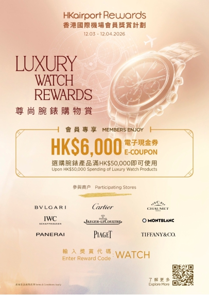 另外,HKairport Rewards 会员由3月12日至 4 月 12 日期间,于机场选购腕表或相关配件,单一消费满港币 50,000 元,即可享立减港币 6,000 元,相当于12% 折扣,同时可享2X 积分及Mastercard签账奖赏!会员只需于「My HKG」流动应用程式内输入奖赏代码「WATCH」,即可领取港币 6,000 元电子现金券。参与推广的 9 间国际知名品牌包括:Bulgari、Cartier、Chaumet、IWC SCHAFFHAUSEN、Jaeger-LeCoultre、Montblanc、Panerai、Piaget及Tiffany & Co.。