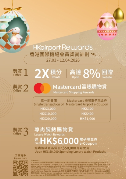 香港 -Media OutReach Newswire- 2026年3月27日 - HKairport Rewards 呈献复活节缤纷购物礼遇,包括 2 倍积分、高达 HK$1,000 Mastercard 机场现金券及尊尚腕表HK$6,000购物赏优惠,为旅客的复活节旅程增添惊喜与欢乐。