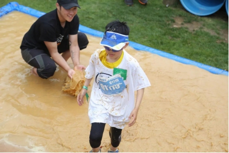 家长孩子齐上阵的的亲子泥泞跑中,小朋友化身“小大人”,与爸爸妈妈组队在迂回的山路和重叠的关卡中奋力争先。