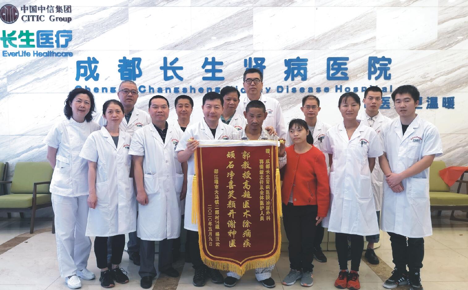 5月9日,是杨先生出院的日子。杨先生和家属被郭主任高超的技术所折服,一定要送一面锦旗表示感谢。郭振新主任也真诚地表示,泌尿外科还没有正式开诊,就有患者相信我们,以性命相托,我们也要感谢这位患者,为什么我们就不能给患者送一面锦旗表示感谢呢?于是,就有了医院和患者互送锦旗的感人场面。