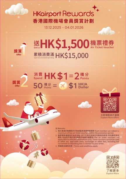 由 2025 年 12 月 13 日至 2026 年 1 月 4 日,于机场店铺或 HKairportShop.com 机场网上商店购物,即可享多重节日礼遇!