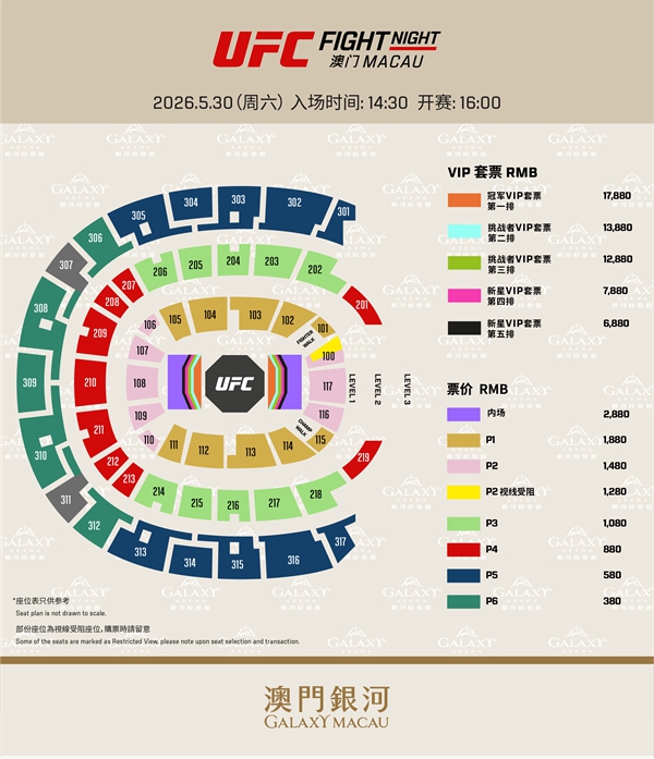「澳門銀河」与UFC联合呈献的2026年度《UFC格斗之夜澳门》及《UFC精英之路》第五季首轮赛事将于5月28至30日展开,门票将于4月17日正式公开发售。而银河致尚小程序会员更可于4月14日起享有优先购票福利。