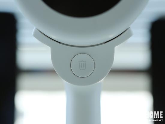 再靠下一点的位置则有一个垃圾倾倒按键,按下去之后前端的尘桶就会抬起,并且将前端的防尘盖打开,用户只需要将垃圾倾倒后向下按下去即可恢复原始状态,对于倾倒垃圾来说非常方便,这也是目前最为方便的垃圾倾倒方式之一。